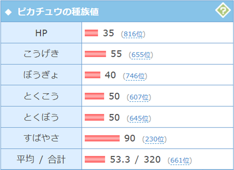 例えばピカチュウは上記画像のような種族値をしており、「すばやさ」に優れたポケモンであると言えます。