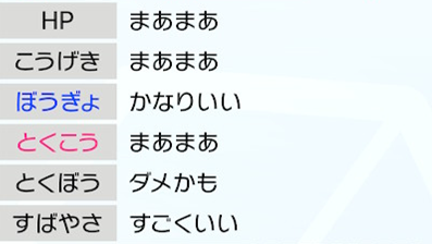 | 性格 | こうげき | ぼうぎょ | とくこう | とくぼう | すばやさ |