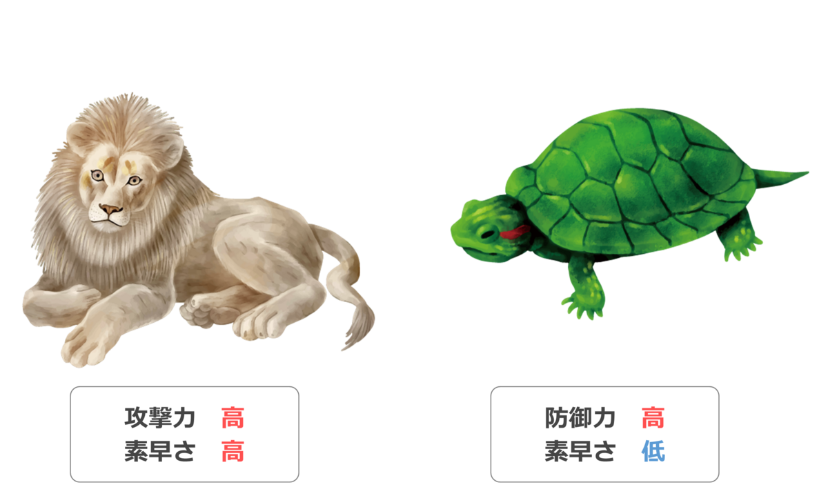 上記の例だと、ライオンの種族は「こうげき」「すばやさ」が高いような種族値をしており、亀の種族は「ぼうぎょ」は高いが「すばやさ」が低いような種族値をしている、といった形になります。