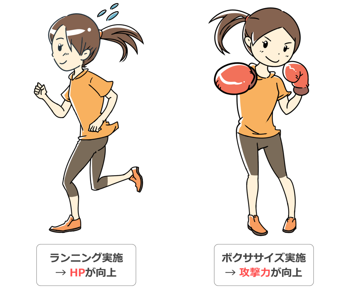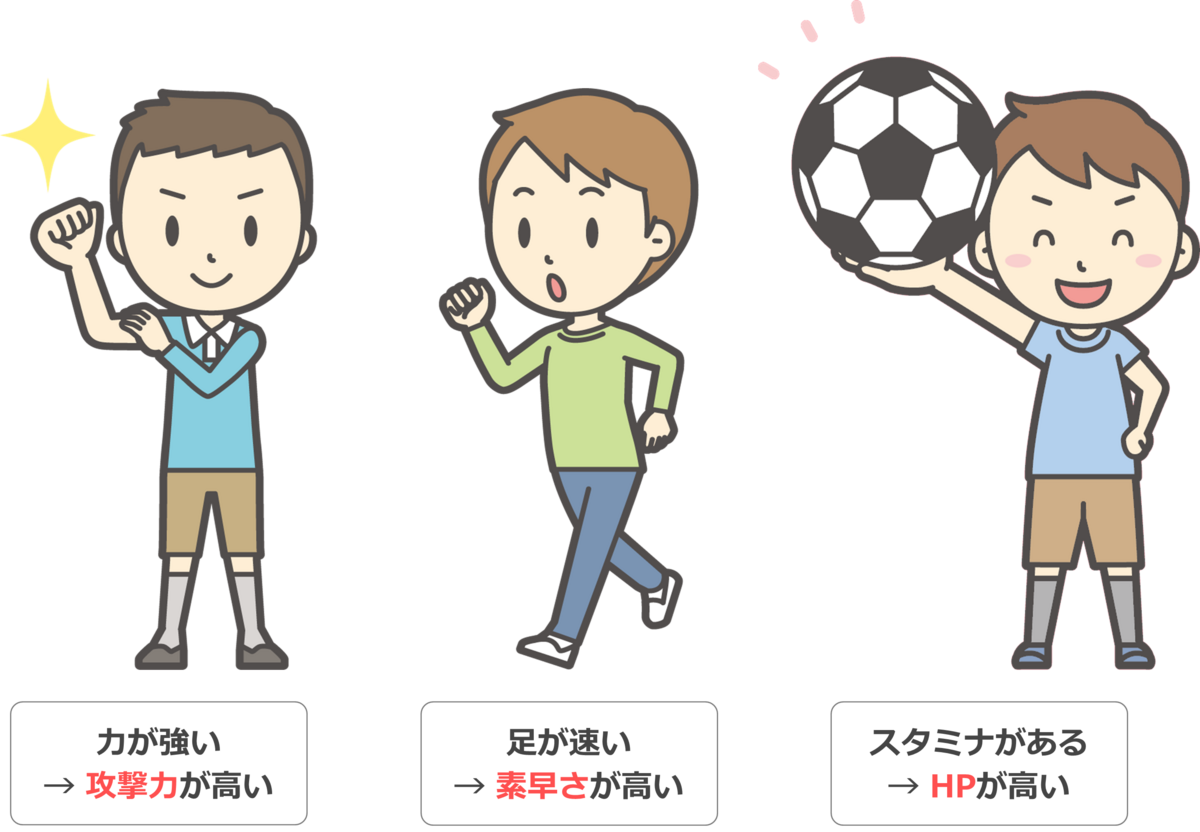 言い換えれば、生まれつきA君は「攻撃力」、B君は「素早さ」、C君は「HP」に優れた人であると言えます。