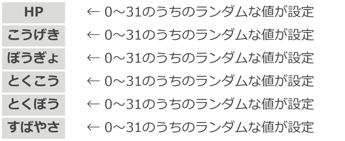 先程のイメージと同様、ポケモンのゲームでは捕まえたポケモンの個体ごと・ステータスごとに個体値が定められています。