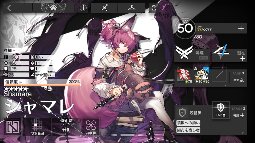 わずかな育成素材や龍門幣を何とか工面して星6オペレーターのスキル特化に励むくらいなら、まずシャマレを育てた方がいいです。