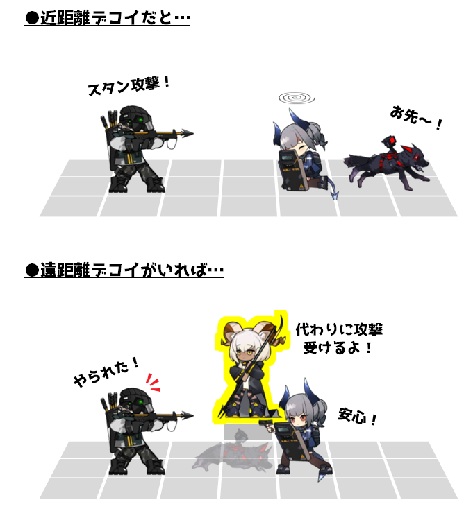 ・遠距離攻撃でスタンさせてくる「狙撃歩兵」に対し、近距離デコイだとスタンすることでブロックできなくなり敵が通り抜ける危険があるが、遠距離デコイであるビーズワクスはその心配がない
