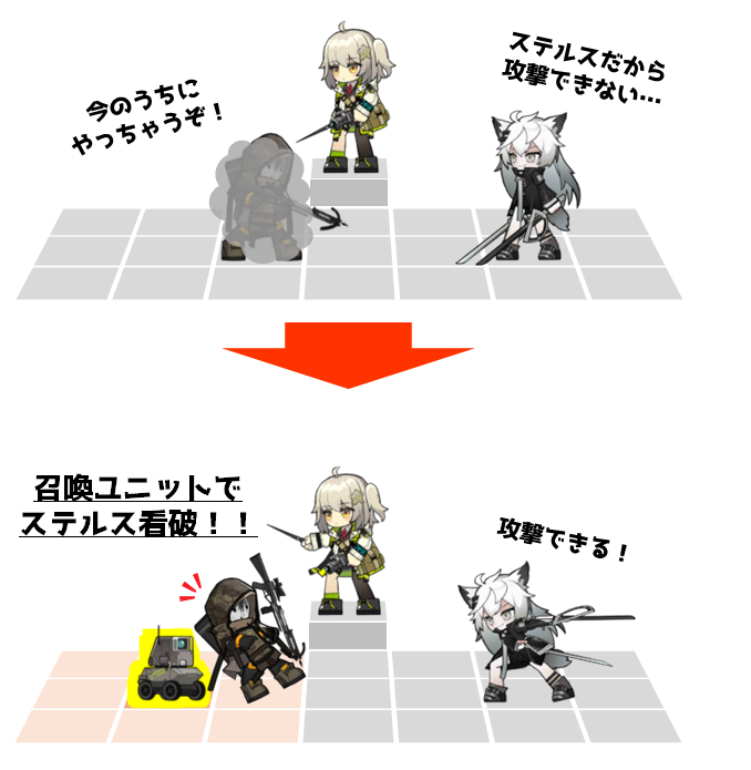 | モジュール | <特性追加> 自身の召喚ユニットが配置されてない状態で召喚ユニットを配置時、残り配置可能数が減少しない(配置中の最後の召喚ユニット撤退時、残り配置可能数は増加しない) <素質1更新> 「撮影ロボット」を最大5体召喚可能。撮影ロボットの周囲8マス以内の敵全員のステルス状態を無効にしてさらに移動速度-8% |