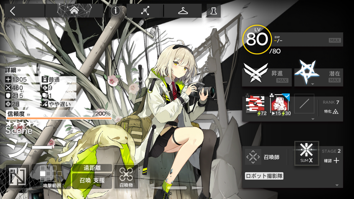 | スキル2 | 【自動回復】【手動発動】 初期SP:15 必要SP:30 持続:20秒 配置可能な「撮影ロボット」を1体獲得し、撮影ロボット全員のアンチステルス効果範囲拡大、攻撃力+130%、防御力+130%、術耐性+20 スキルの効果時間終了後撮影ロボット全員が5秒間スタン状態になる |