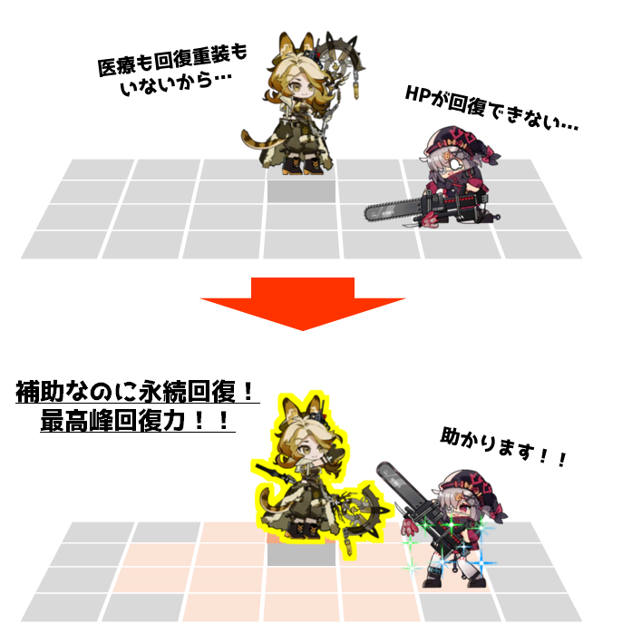 ・医療オペレーターよりも攻撃速度が速いことや、医療オペレーターより攻撃範囲が広いことから、普通に優秀な回復役として採用することも