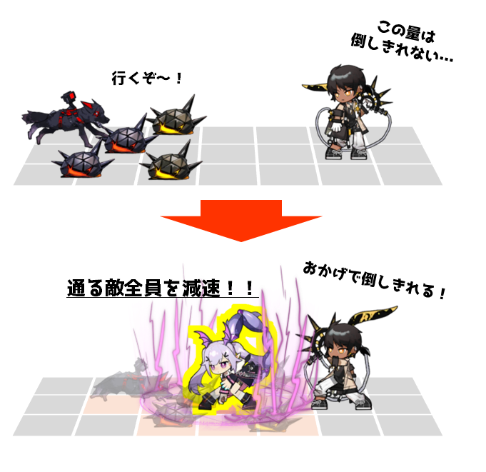 ・スキル2で配置時に周囲8マスの敵全員に物理ダメージと特殊能力8秒無効を与えることができるので、厄介な感染生物の対処が非常に楽になる