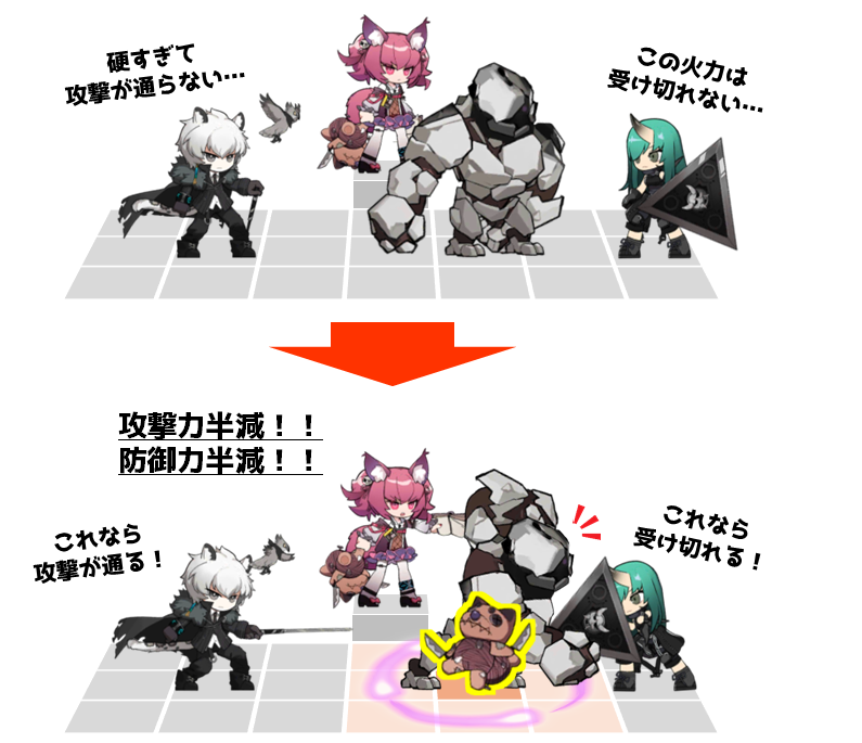 ・アークナイツにおけるデバフの重要性を痛感することができた。被ダメージは激減するし与ダメージは大きくなるしで対ボスに最適