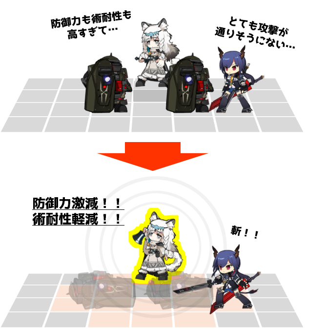 | スキル1 | 【パッシブ】 配置後、攻撃力+70%、攻撃対象の攻撃力を3秒間-40% |